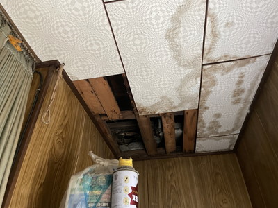 中を覗いてみると、梁や天井下地がすでに腐食し、構造的にもかなり深刻な状況です。