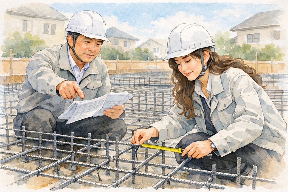 鉄筋の配置・間隔・かぶり厚さ、アンカーボルト位置などを確認します。また、コンクリート打設後のひび割れや精度もチェックし、基礎の品質を確保します。