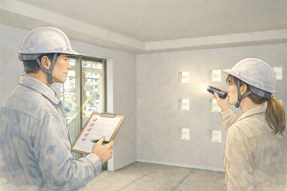 全体の仕上がり、不具合の有無、設備の動作確認を行い、是正が必要な箇所を整理します。キズ・汚れ・仕上げ精度・建具の動作などを確認します。