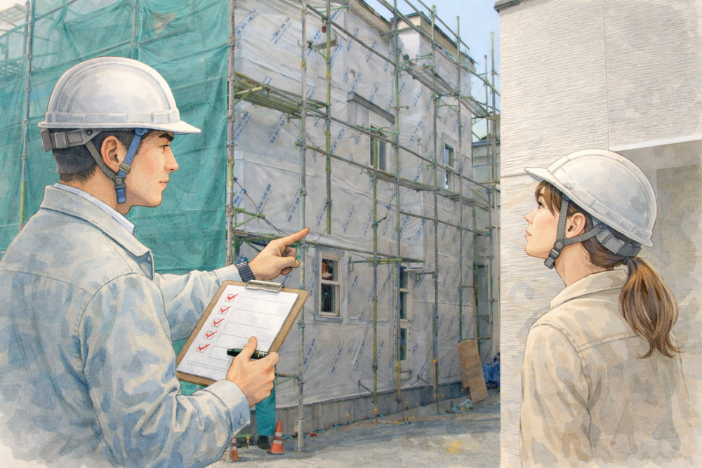 通気層の確保、防水処理、開口部まわりの納まりなどを確認します。外壁仕上げ後では見えなくなるため、事前確認が重要です。