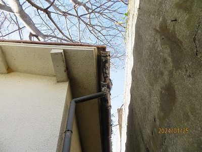 これにより、雨水の流れが悪化し、継手部からの漏水やあふれが発生しやすくなります。劣化が進むと、外壁や軒先木部の腐食を招く恐れがあるため、早期の補修や交換の検討が望まれます。
