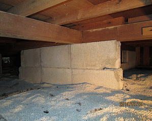 基礎は、ブロック積みである。鉄筋コンクリート造基礎に比べ、強度はかなり落ちる