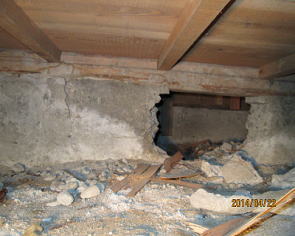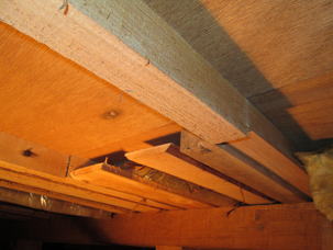 床板の継目部分の根太が切れている。床を踏むとへこんだり、地震がくると壊れる。