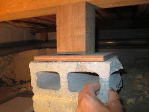 束がブロックの上にベニヤ板をはさんで置いてあるだけ。地震がくると、床が壊れる。