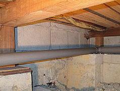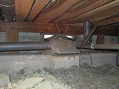 床下には排水管が設置されています。設置状況が不適切な場合、地震時に配管が動いたり、勾配が狂ったりすることがあります。また、継手部分からの水漏れは非常に多いため、重点的に確認します。